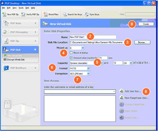 PGP Virtual Disk Volume 可使用你硬碟的一部份空間當作加密的磁碟區, 它會有獨自的磁爹碟機代號(如E: ),你可以增加其它人的公鑰進去,這些被授權的人就能存取你的虛擬磁碟機。