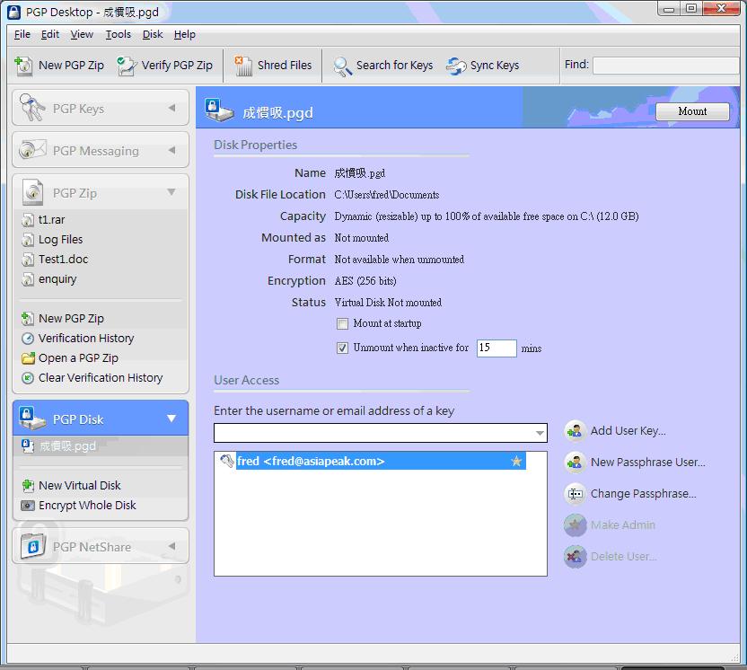 要Mount這個磁碟機, 你可以在[PGP Disk]控制箱上選擇這 PGP Disk,然後在右邊主畫面按[Mount]。這樣你就可以看到一個磁碟機代號。