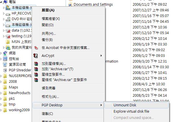要unmount這磁碟機,你可以直接在磁碟機代號上按滑鼠右鍵,選擇 [PGP Desktop] >> [Unmount Disk]。