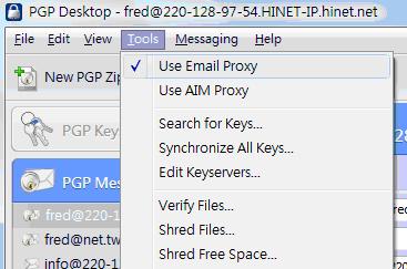 確認你的eMail Proxy有打開,PGP DT[主選單] >> [Tools] >> [Use eMail Proxy]打勾,如下圖。