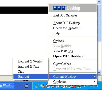 2. 滑鼠右按螢幕右下角的PGP 圖案,選擇 [Current Window] >> [Encrypt]