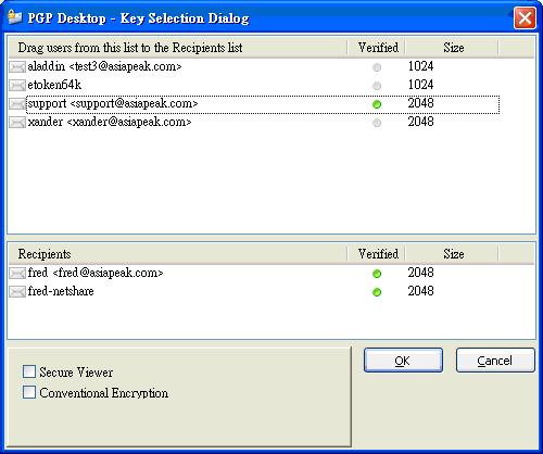 3. 出現選擇公鑰畫面,從上面公鑰清單欄位,選一些公鑰到下面Recipients 欄位。按[OK]。