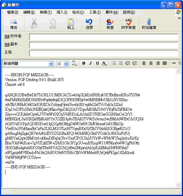 5. 然後你可以將它寄出去,收件人如果有相對應的私鑰就能自動或手動方式解回原來的內容。