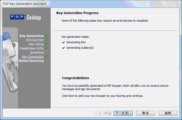 7. 大約幾秒鐘後,金鑰產生完畢,按 [下一步]。