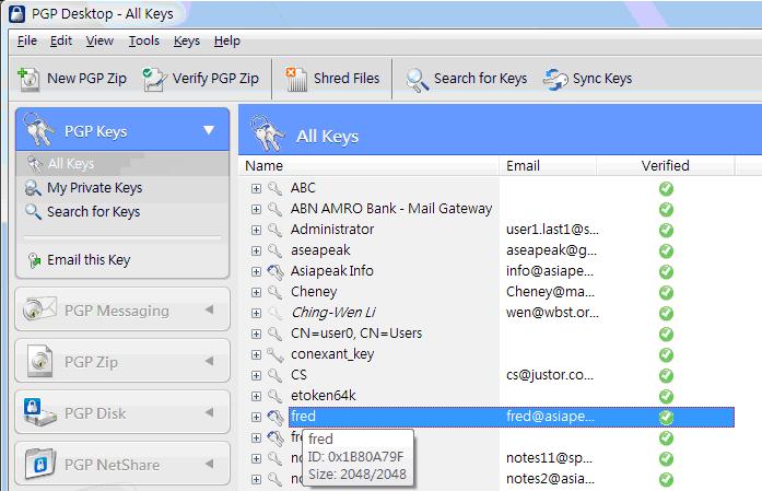 9. 完成後你應該可以在[PGP Keys]控制盒下看到你剛剛產生的金鑰。