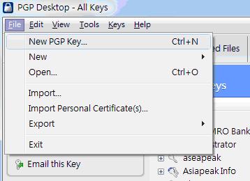 1. 畫面左邊選[PGP Keys] 控制盒,在選單中選 [File] >> [New PGP Key]。