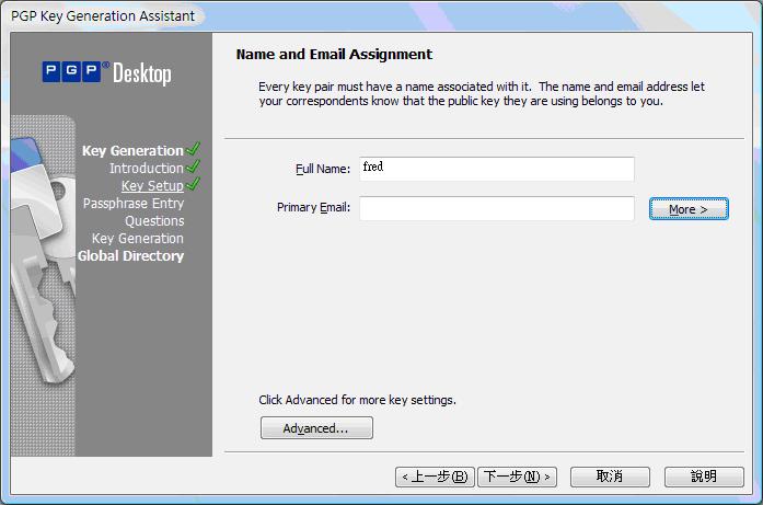 3. 按 [下一步] (Next),出現 [Name and eMail Assignment] 畫面,請輸入金鑰名稱,如果你要用到PGP eMail功能,請輸入你的email。如果你加密資料往來對像是舊版的PGP,建議你按 [Advanced..] 按鈕進去選擇金鑰的屬性,如果你不需要,就直接按 [下一步],然後跳到步驟5。