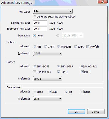 4. (*進階功能*)出現 [Advanced Key Setting] 畫面,為了要相容於舊版PGP (註: 所謂舊版,通常指早於 PGP 8.x,但這仍與對方用的金鑰有關,如有進一步問題,可與我們連絡),Key Type 可選 [Diffie-Hellman/DSS];在 [Ciphers] 欄位裡將所有演算法都打勾,Preferred 可選最舊的 [CAST]; [Hashes] 欄位裡將所有湊雜函數都打勾,Preferred 選 [SHA-1];在 [Compression] 欄位裡將所有壓縮法都打勾。按 [OK] 再按 [下一步]。