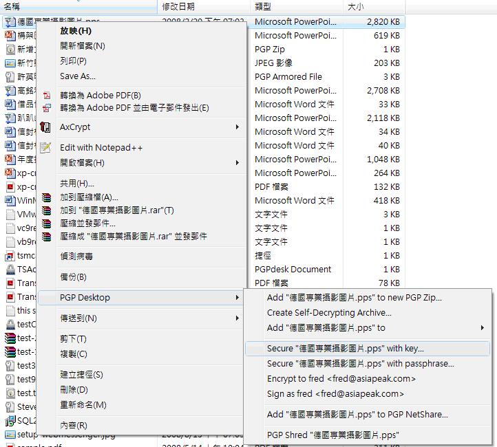 1. 將滑鼠移到你要加密的檔案上,按滑鼠右鍵,選擇 [PGP Desktop…] >> [Secure …. With key….]。