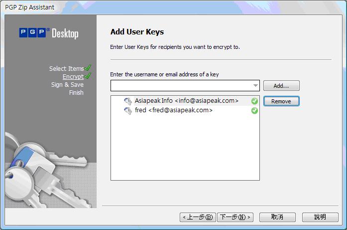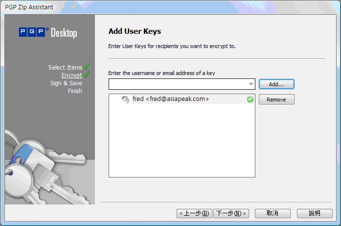 2. 出現 [Add User key] 畫面,這地方就是要你選擇用哪一個(或那些)公鑰來加密。按[Add..] 按鈕。