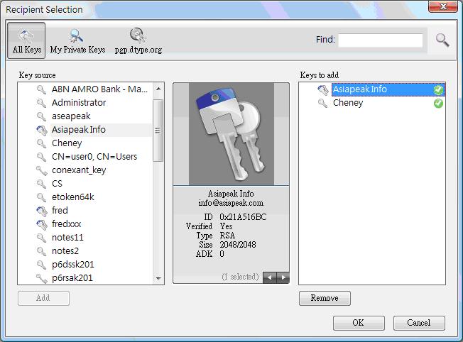 3. 出現 [Recipient Selection]畫面,請從左面的金鑰選擇加入到右邊,按[OK]繼續。